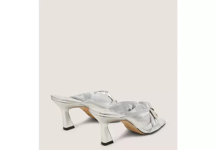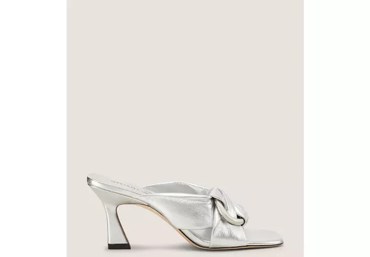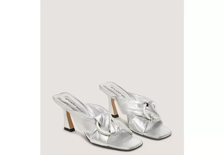 Elevated design details set the CECE SLIDE 75 apart. Crafted by SW artisans in Spain, it features wide interlocking straps paired with a polished O-ring hardware accent, a striking 75-mm angled heel and a modern square toe.
