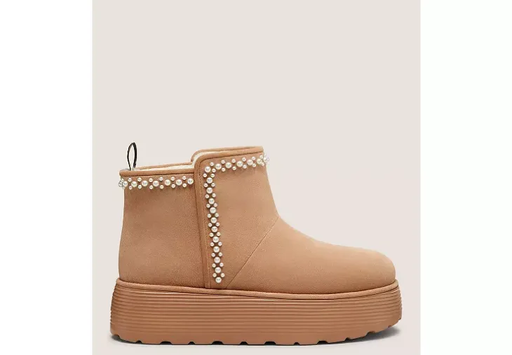 The NELLIE PEARL FLATFORM BOOTIE pairs elegant pearl embellishments and a luxe shearling lining with a laid-back ankle boot silhouette. Its 40-mm flatform gives it a stylish lift while remaining effortlessly comfortable.