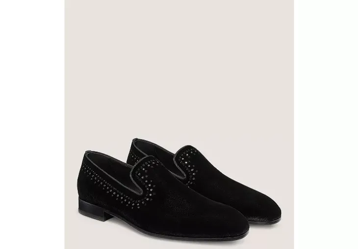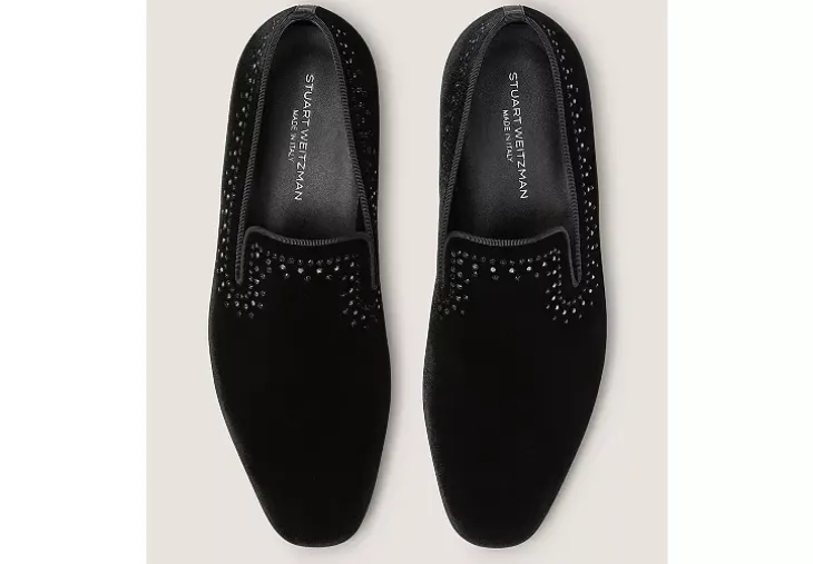 The PREMIERE PARTY LOAFER makes a glamorous statement all its own. Crafted from plush velvet with hand-placed black and clear crystal embellishments, this luxurious design is a testament to the expert craftsmanship of our artisans in Italy.