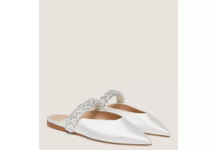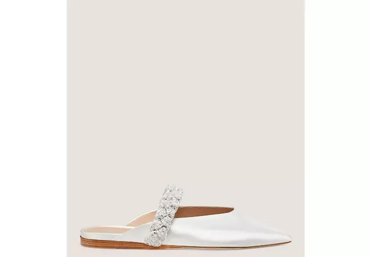 The ROYALE PEARL BRAIDA FLAT delivers the timeless glamour of a high-heel pump and wearable comfort of a flat — all at once. Crafted by our artisans in Spain, it features an intricate braided vamp detail adorned with approximately 2,200 crystal and pearl embellishments per pair. A sleek pointed toe further streamlines this outfit-making style.