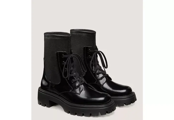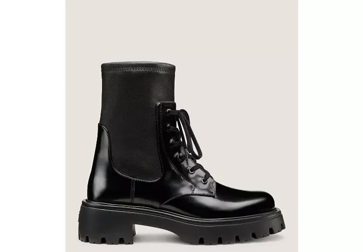 The EVERITT BOOTIE features a modern, rugged square toe and a stretch-infused shaft that nods to our signature brand code, allowing for easy slip-on without having to undo the laces. An edgy lug sole and a 50-mm block heel complete this fashion-meets-function design.