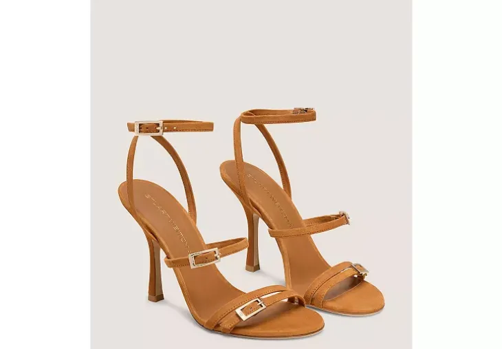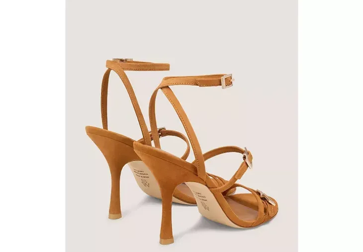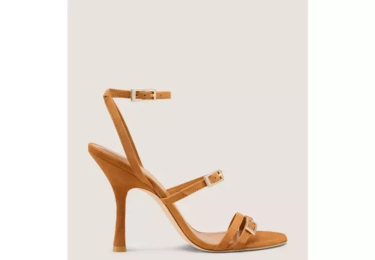 The GEORGIE 100 offers an elegant-meets-edgy take on the classic strappy sandal design. It features polished angular buckles atop sleek straps, a wraparound ankle strap and a 100-mm sculptural stiletto heel that further elevates the look without sacrificing comfort.